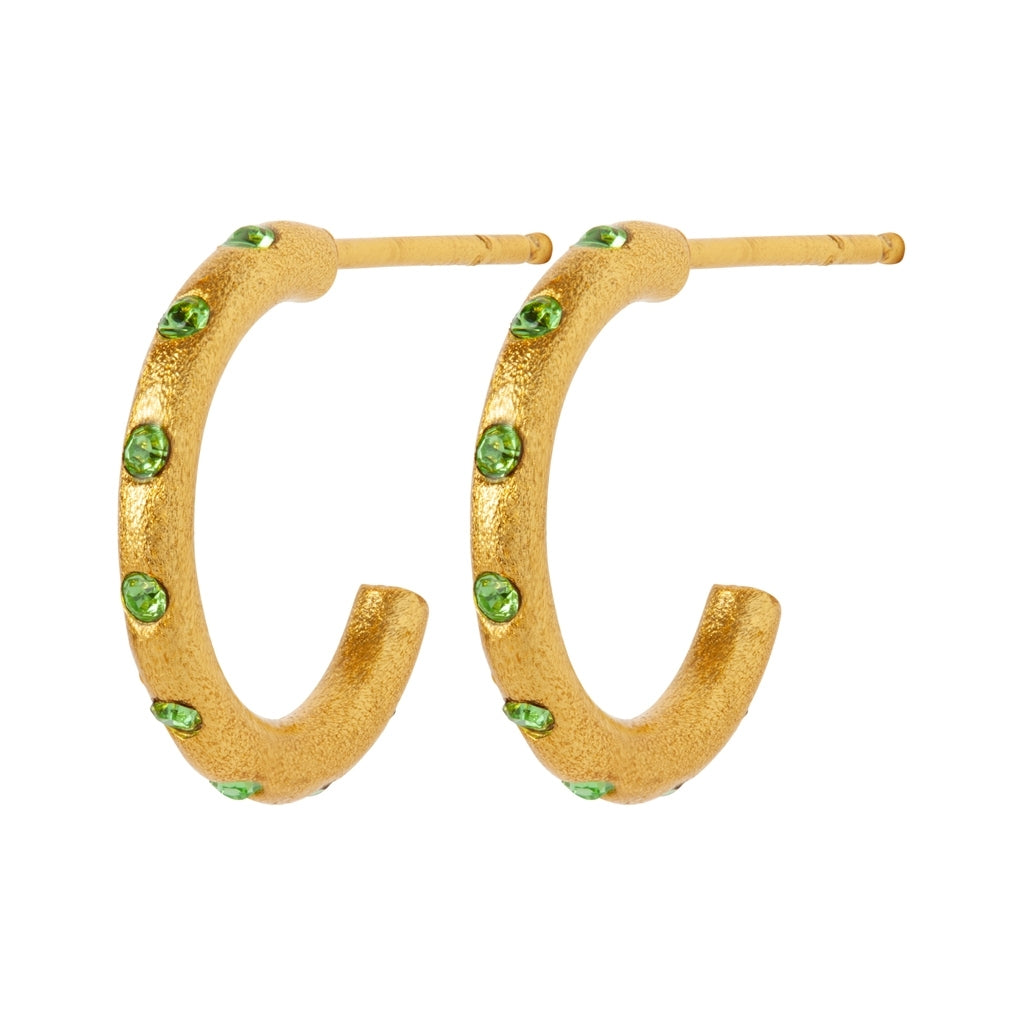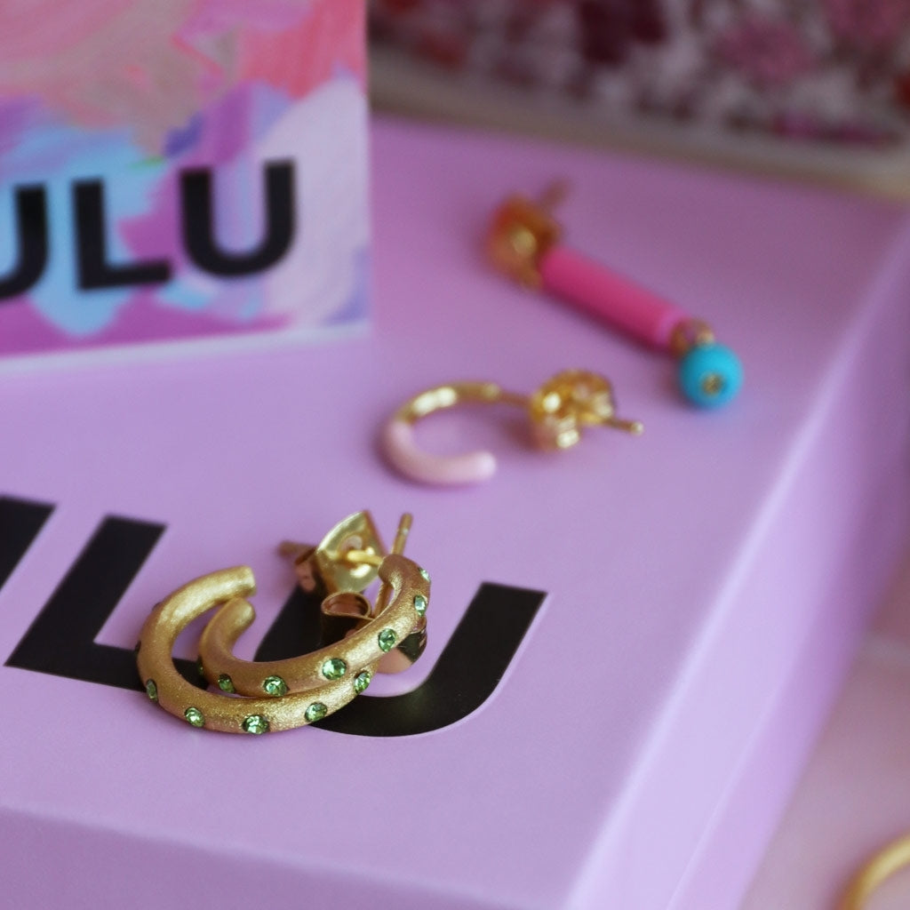 The small, brushed OMG hoops are available in 2 beautiful colors: the soft light pink crystals and the eye catching, sparkly green crystals.